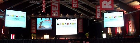 Auf großer Bühne und 6 Projektionsflächen stellte sich die REWE Group den 900 Gästen als großes europäisches Handels- und Touristikunternehmen vor. Anschließend vergnügten sich die Gäste im Heidepark.